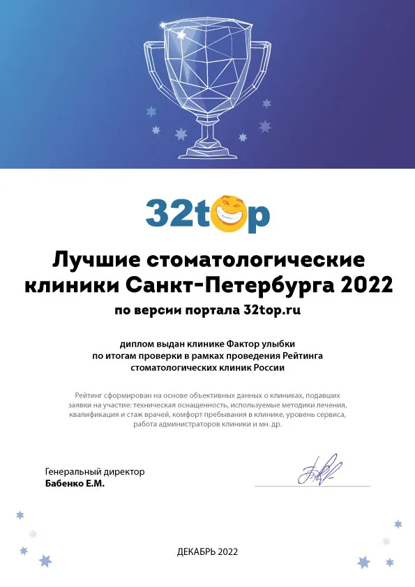 Сеть клиник "Фактор Улыбки" вошла в рейтинг "Лучшие стоматологические клиники Санкт-Петербурга 2022" по версии портала 32top.ru