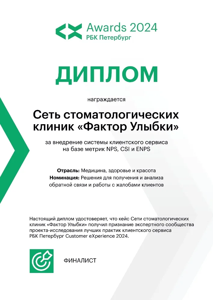 Сеть стоматологических клиник "Фактор Улыбки" получила признание экспертного сообщества проекта-исследования лучших практик клиентского сервиса РБК Петербург Customer eXpirience 2024
