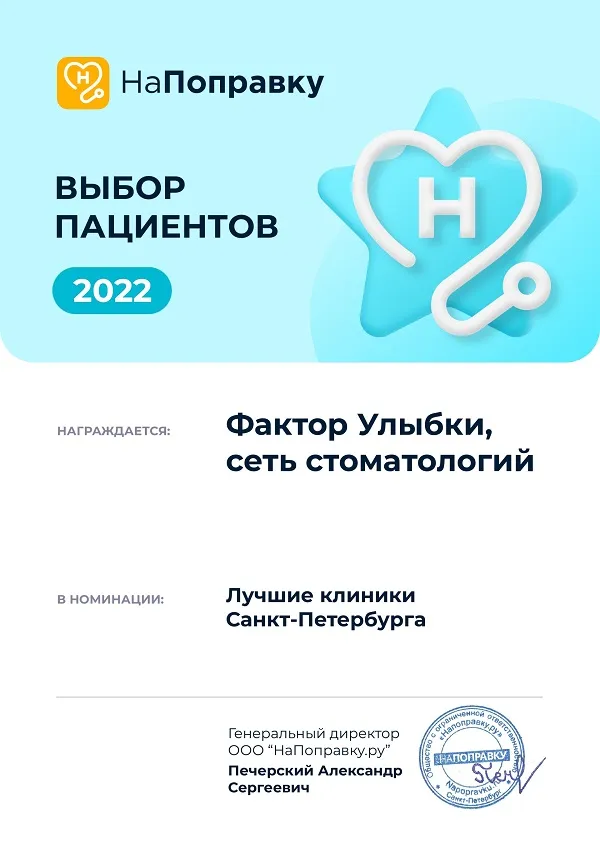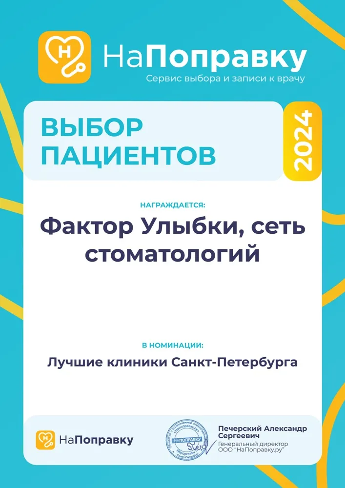 Сеть стоматологических клиник "Фактор Улыбки" - победитель в номинации "Лучшие клиники Санкт-Петербурга" премии «Выбор пациентов 2024 год» сервиса "НаПоправку.ру"