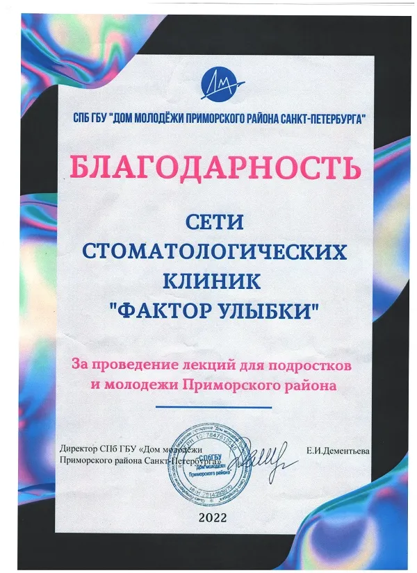 В 2022 году сеть клиник "Фактор Улыбки" получила благодарность от СПБ ГБУ "Дом молодежи Приморского района Санкт-Петербурга" за проведение лекций для подростков и молодежи Приморского района