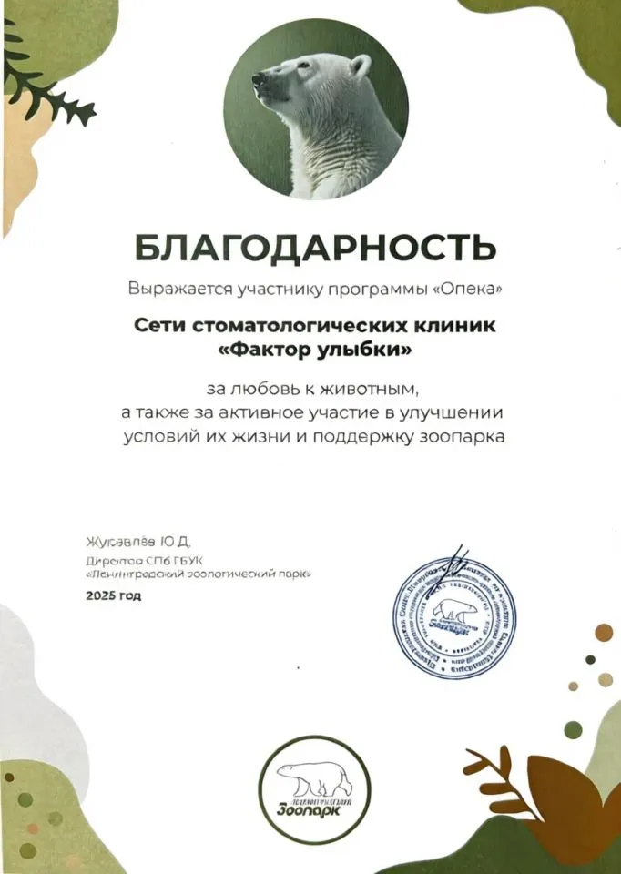 Сеть стоматологических клиник "Фактор Улыбки" является активным участником программы "Опека", за что руководство Ленинградского зоопарка вынесло свою благодарность в 2025г