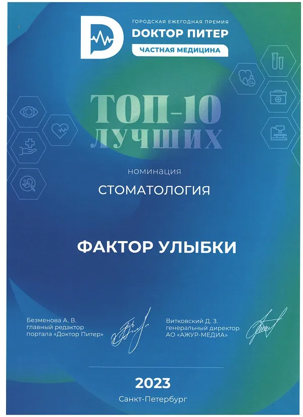 Сеть стоматологических клиник "Фактор Улыбки" входит в ТОП-10 лучших стоматологий 2023 года по версии портала "Doктор Питер"