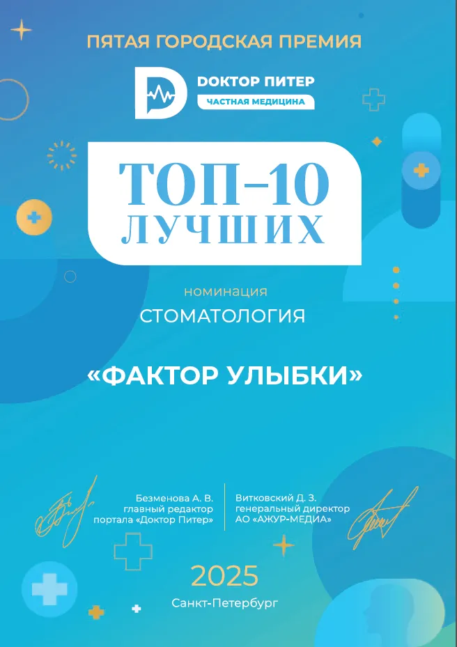Сеть клиник "Фактор Улыбки" входит в ТОП-10 лучших стоматологий 2025 года по версии портала "Doктор Питер"