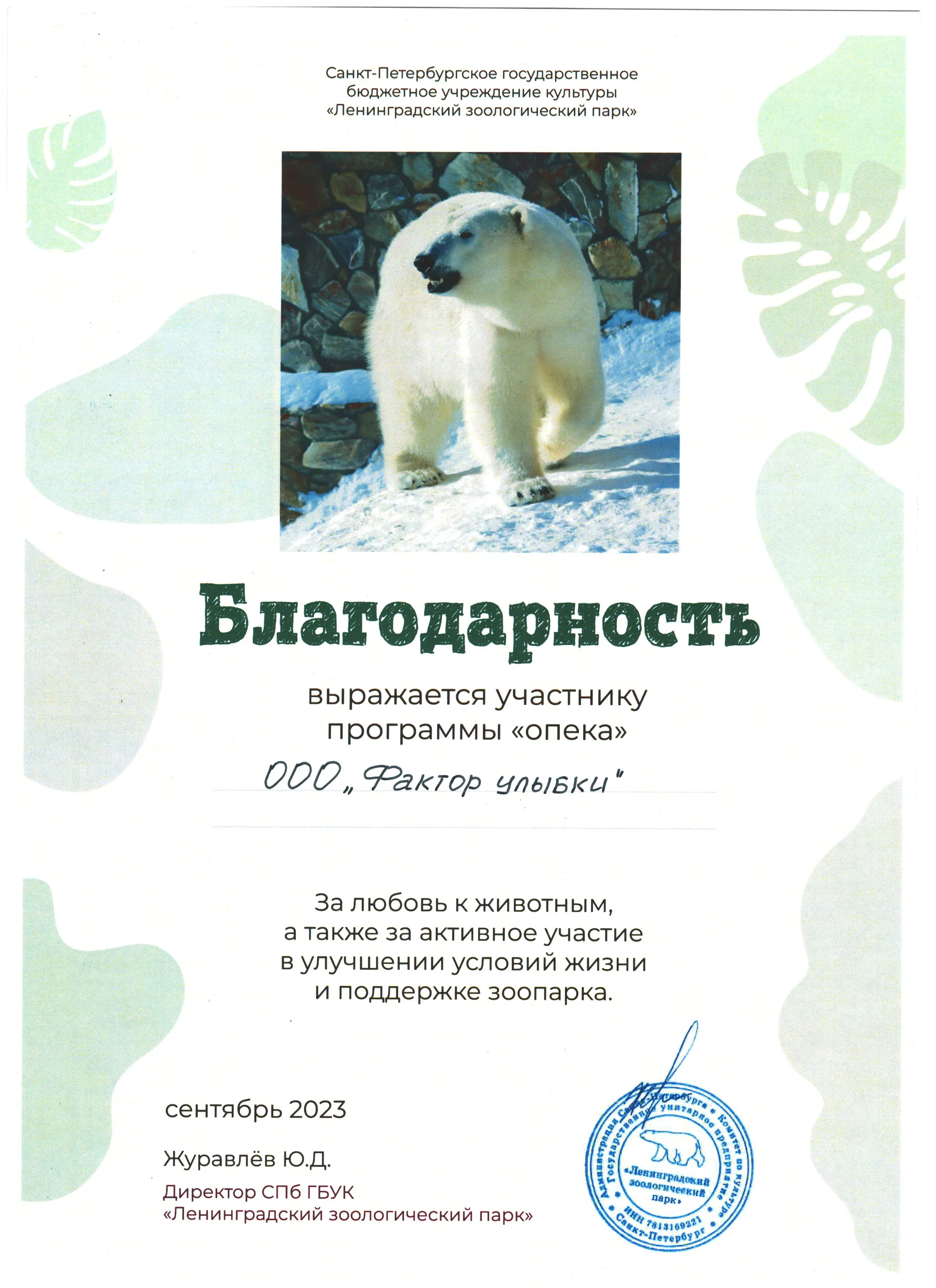 Сеть клиник "Фактор Улыбки" получила благодарность руководства Ленинградского зоопарка за активное участие в программе "Опека" в 2023 году