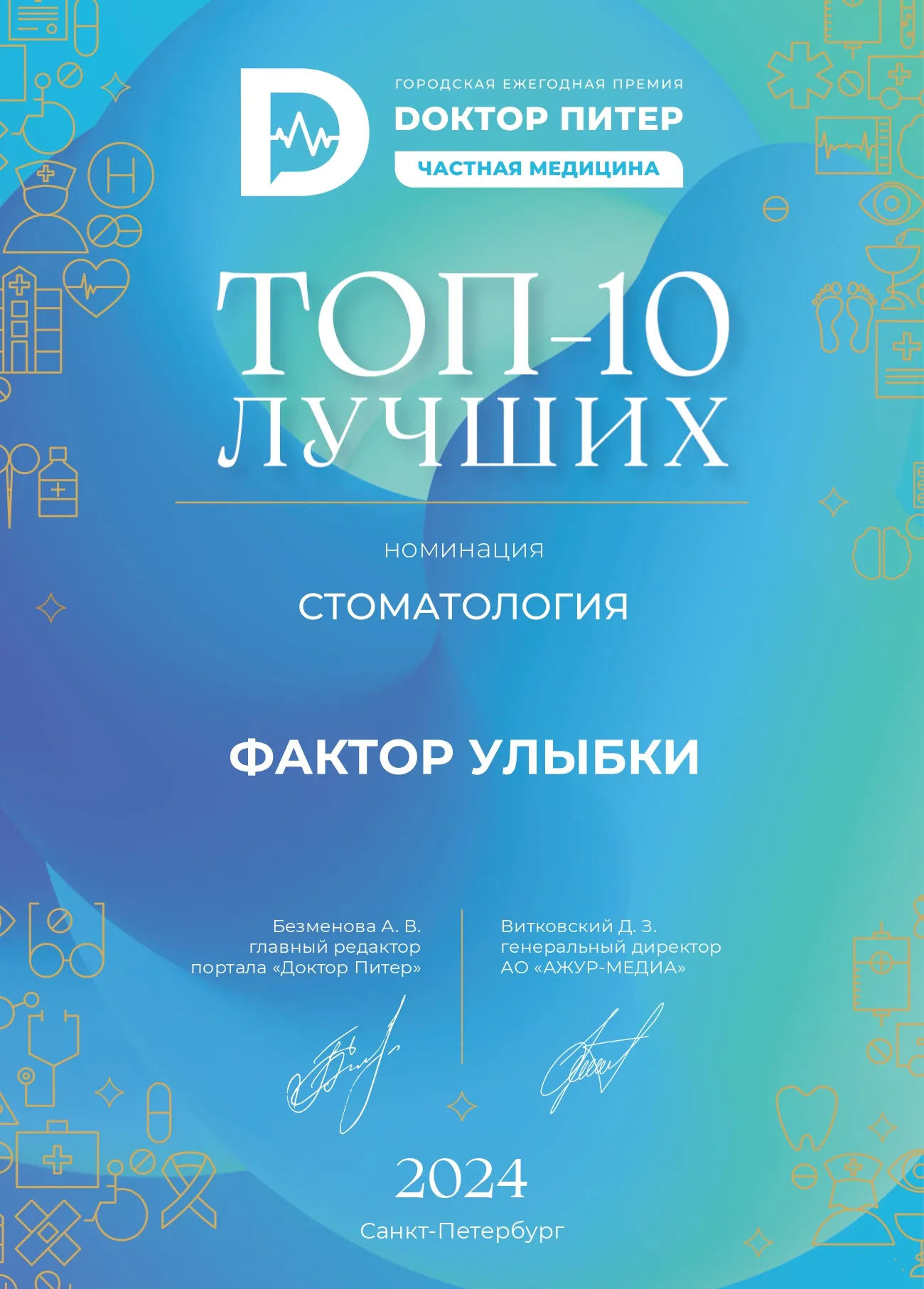 Сеть стоматологических клиник "Фактор Улыбки" вошла в ТОП-10 лучших стоматологий 2024 года по версии портала "Doктор Питер"