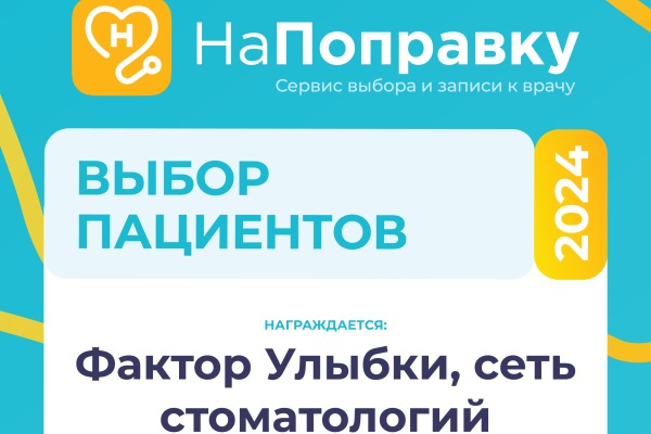 "Фактор Улыбки" признана лучшей стоматологической клиникой 2024 года по версии портала НаПоправку в номинации "Выбор пациентов"!